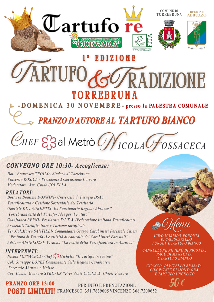La manifestazione si concluderà con un pranzo d’autore dedicato al tartufo bianco e alla cucina abruzzese, accompagnato da musica e intrattenimento.