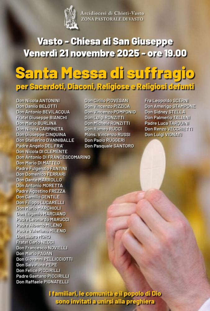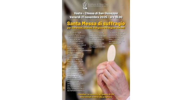 Una Santa Messa di suffragio verrà celebrata venerdì 21 novembre, alle ore 19, nella Cattedrale di San Giuseppe a Vasto.