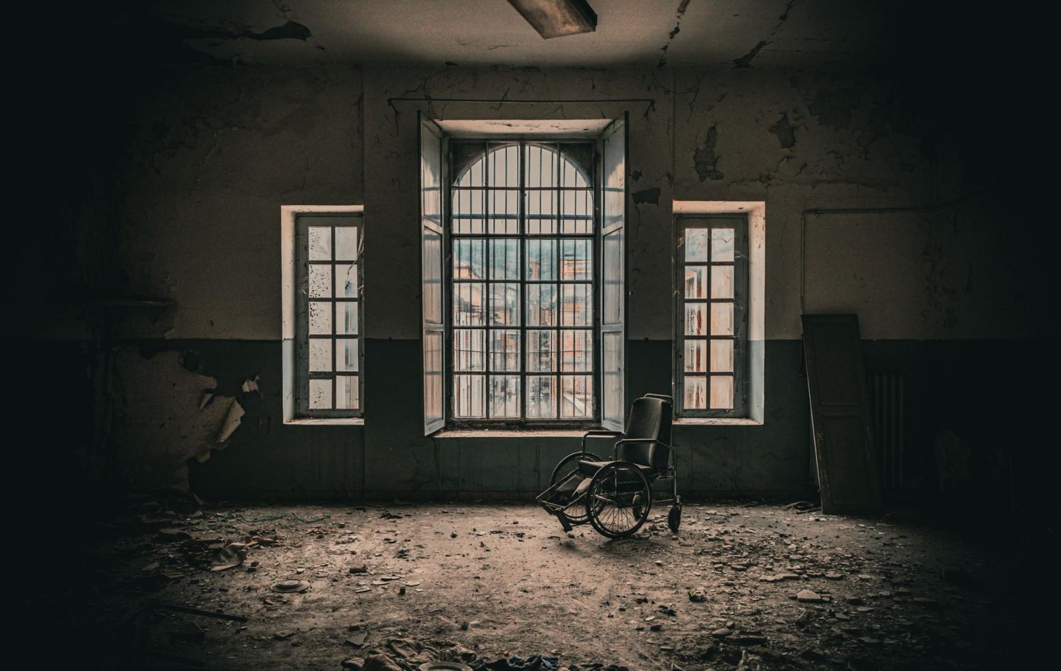 Un corridoio stretto e scrostato, con una vecchia barella abbandonata, una stanza vuota con una sedia a rotelle al centro, illuminata da una finestra sbarrata, trasmette isolamento e sospensione del tempo.