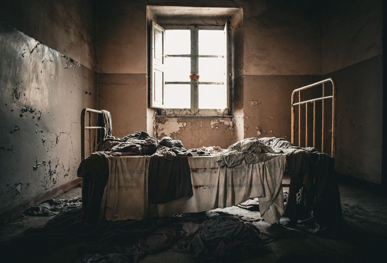 Un letto di ferro disfatto, materassi ingialliti, tessuti impolverati, una finestra spalancata e muri scrostati raccontano di fragilità, di vite interrotte e memoria che si sgretola.