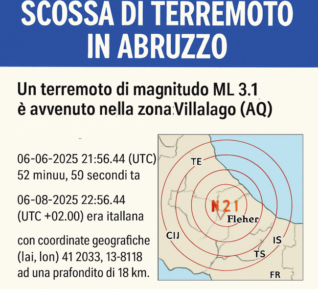 Una scossa di terremoto di magnitudo ML 3.1 è stata registrata questa sera, 6 agosto 2025, alle ore 23:56 (ora italiana), nella zona di Villalago, in provincia dell’Aquila. L’evento sismico è avvenuto precisamente a 2 km a ovest del comune montano, con coordinate geografiche 41.9283 di latitudine e 13.8118 di longitudine, e a una profondità di 18 chilometri.