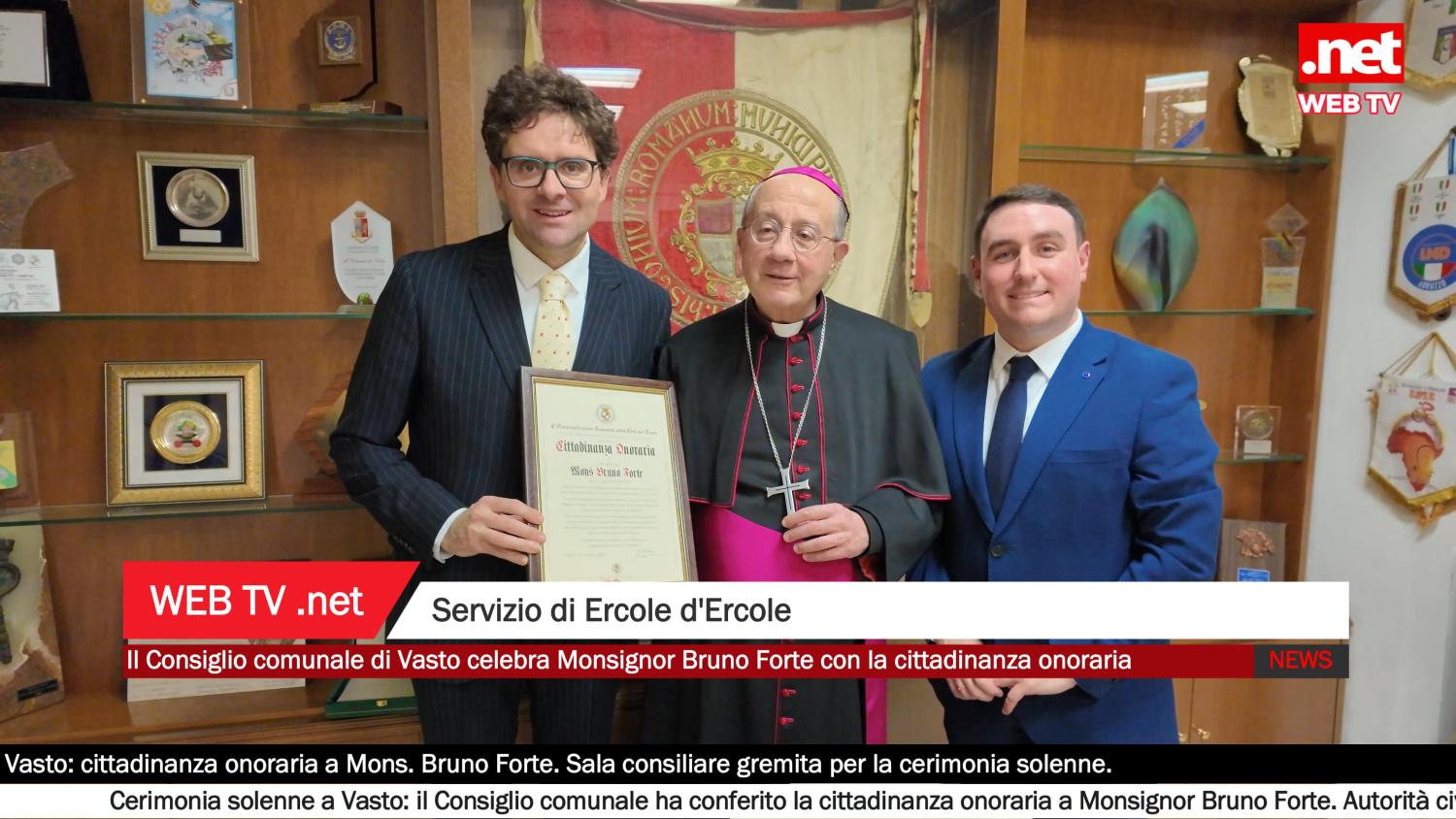 Il Comune di Vasto ha conferito la cittadinanza onoraria a Monsignor Bruno Forte, arcivescovo di Chieti-Vasto, in una cerimonia solenne svoltasi all’interno di un vero e proprio Consiglio comunale. La sala consiliare era gremita di autorità civili, militari ed ecclesiastiche, a testimonianza della rilevanza dell’evento e del profondo legame tra il vescovo e la comunità vastese.