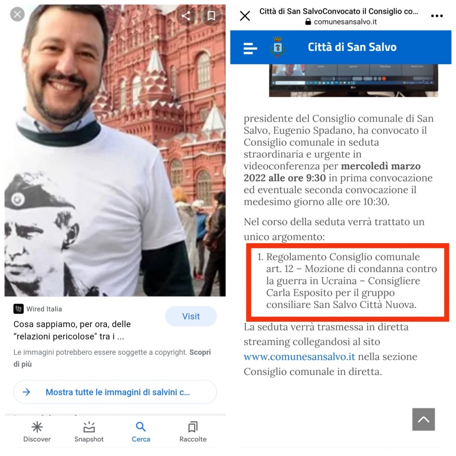 Un nostro affezionato lettore ci ha inviato questa immagine, in cui in una metà si vede Salvini con la maglietta di Putin e nell' altra l' ordine del giorno dell'odierno Consiglio comunale (di cui diamo conto in altra parte del giornale).