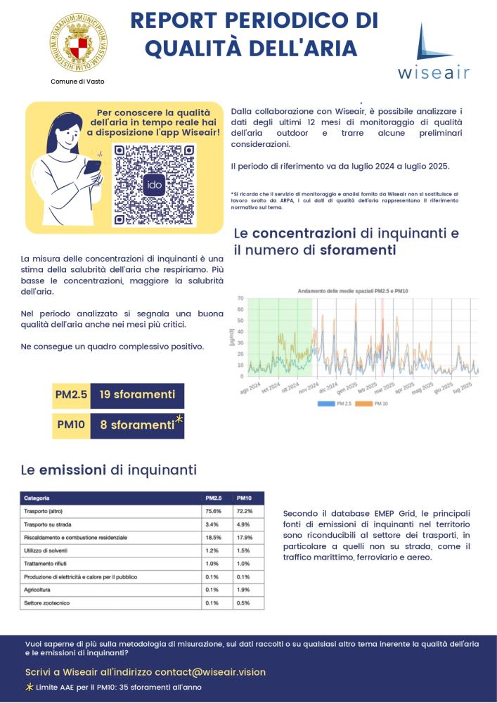 «Dopo un anno di monitoraggio continuo e analisi dei dati raccolti in collaborazione con Wiseair, possiamo affermare con soddisfazione che la qualità dell’aria che respiriamo a Vasto è buona. Nel periodo compreso tra luglio 2024 e luglio 2025, i livelli di inquinanti rilevati sono rimasti ampiamente al di sotto delle soglie stabilite dall’Agenzia Ambientale Europea: a fronte di un limite massimo annuale di 35 sforamenti per il PM10, nel nostro territorio ne sono stati registrati solo 8, mentre per il PM2.5 i superamenti sono stati 19. Dati che confermano un quadro complessivamente positivo, anche nei mesi tradizionalmente più critici», lo affermano il sindaco Francesco Menna e l’assessore all’Ambiente Gabriele Barisano.