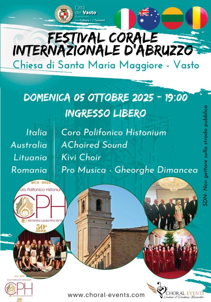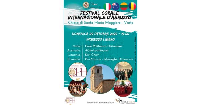 Torna il Festival Corale Internazionale d'Abruzzo, a cura della Choral Events (Francia) con la collaborazione del Coro Polifonico Histonium "Bernardino Lupacchino dal Vasto". Questa edizione vedrà la partecipazione del Achoired Sound - Australia; il Kivi Choir - Lituania, il Pro Musica Gheorghe Dimancea - Romania e le Voci del Frignano - Italia. Il concerto conclusivo del festival si svolgerà domenica 5 ottobre alle ore 19:00 nella chiesa di Santa Maria Maggiore a Vasto, per l'occasione ci sarà una raccolta fondi per le Missioni.