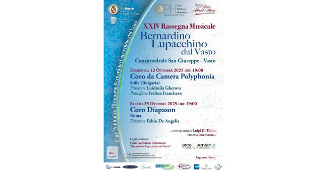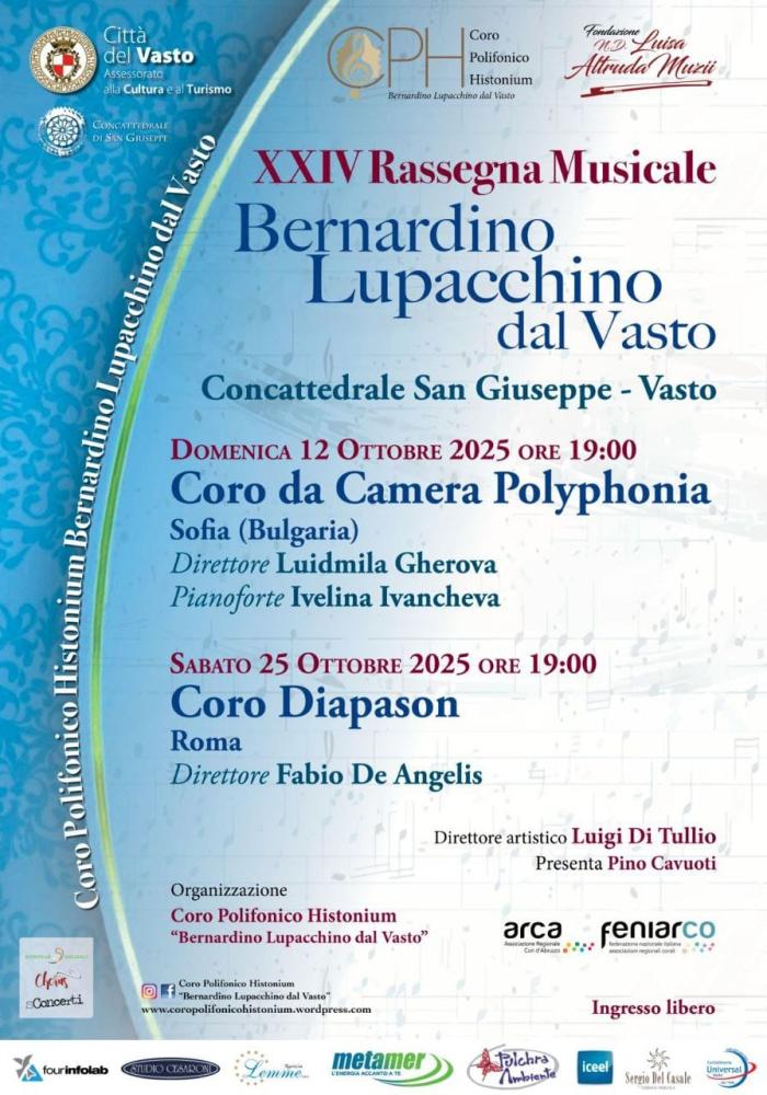 Nel fine settimana avrà inizio la 24esima edizione della rassegna musicale Bernardino Lupacchino dal Vasto. L'evento, organizzato dal Coro Polifonico Histonium con la direzione artistica di Luigi di Tullio, è diventato nel corso degli anni un appuntamento tradizionale e un punto di riferimento per la promozione e divulgazione del canto corale. La rassegna prenderà il via domenica 12 ottobre 2025 alle ore 19:00 nella Concattedrale di San Giuseppe e vedrà la partecipazione del Coro da Camera Polyphonia di Sofia (Bulgaria). Il Coro Diapason di Roma sarà ospite del secondo appuntamento che si terrà sabato 25 ottobre alle ore 19:00 sempre nella Concattedrale. Il Coro Histonium farà gli onori di casa con un breve saluto musicale in apertura dei due concerti. La rassegna è realizzata con il patrocinio dell’assessorato alla Cultura del Comune di Vasto, con il contributo della Fondazione N.D. Luisa Altruda Muzii e di sponsor privati.