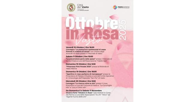 Anche quest’anno Vasto, attraverso l'assessorato alle Politiche sociali, promuove il calendario di iniziative di “Ottobre in Rosa 2025”, un mese dedicato alla prevenzione, alla salute e al benessere femminile.