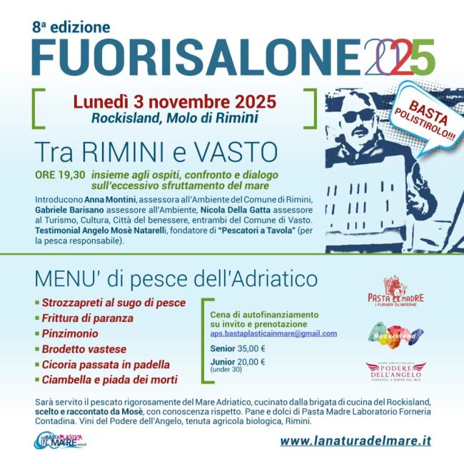 «Nel corso della giornata – spiegano Della Gatta e Barisano - il Comune di Vasto sarà inoltre protagonista del confronto “Tra Rimini e Vasto”, dedicato alle azioni condivise per la riduzione della plastica in mare e la promozione di una pesca responsabile, simbolicamente rappresentata anche dal “brodetto vastese” preparato dallo chef Michael Di Cinto durante la cena conclusiva».