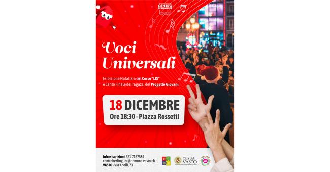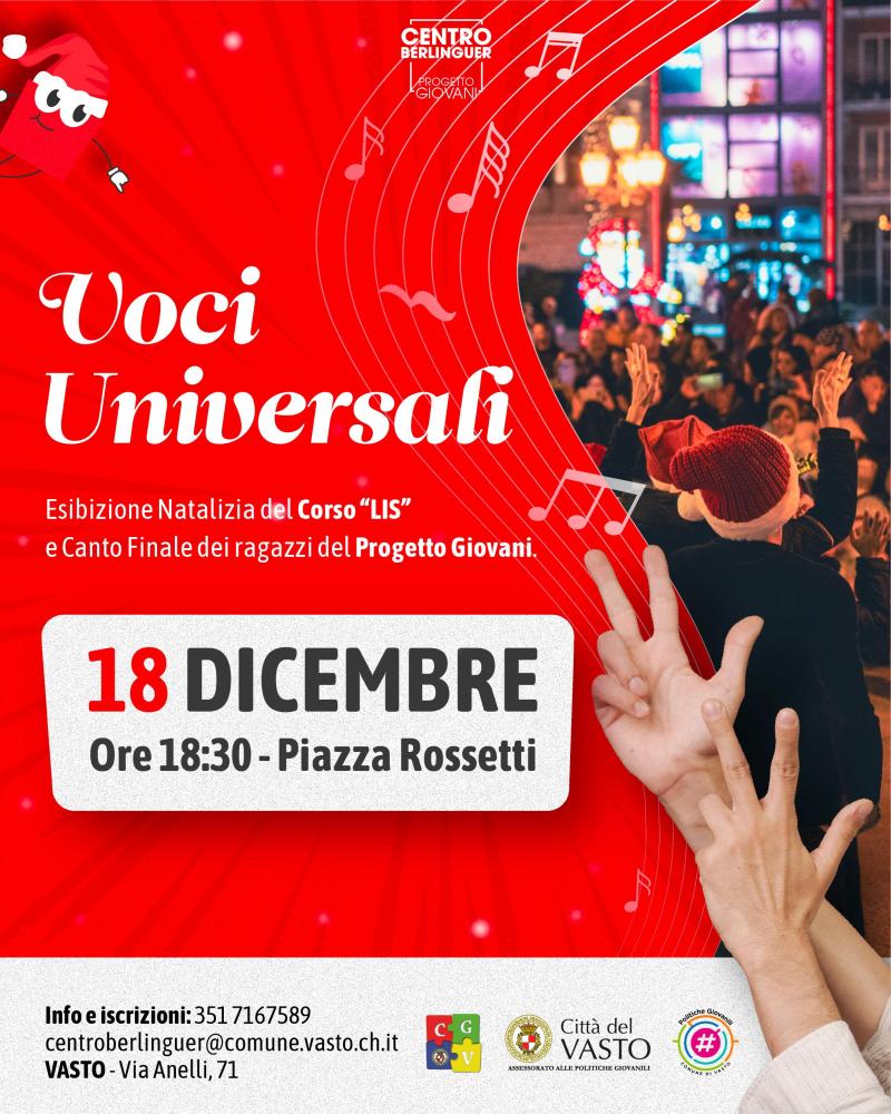 Oggi pomeriggio, 18 dicembre 2025 alle ore 18:30, in Piazza Rossetti si svolgerà l’iniziativa “Voci Universali”, che vedrà esibirsi i partecipanti ai corsi di Lis e canto promossi dal Progetto Giovani e tenuti rispettivamente dalle docenti Fabiana Bolognese (LIS) e Federica Marcello (canto). L'evento è promosso dall'assessorato alle Politiche giovanili. I brani eseguiti saranno “The First Noel”, canto popolare natalizio tradizionale inglese del 1823, oggi conosciutissimo, e “Down to the River to Pray”, canto tradizionale afroamericano dalle linee melodiche gospel e folk. Entrambi i brani verranno cantati e segnati.